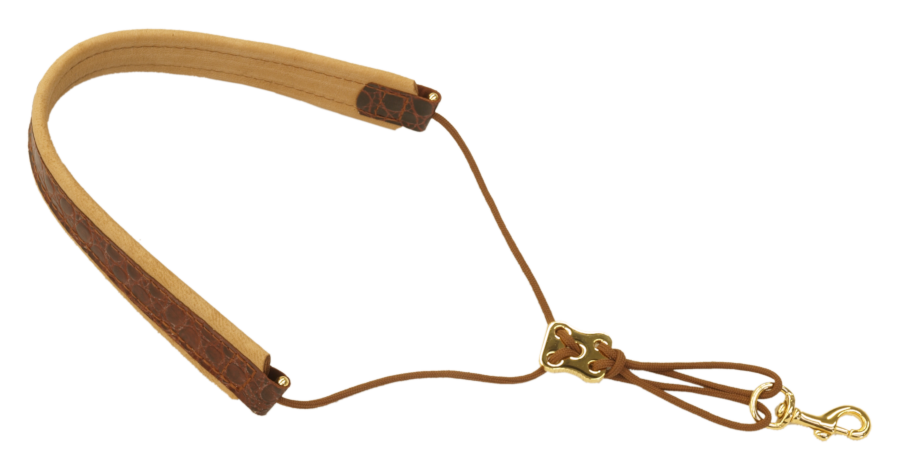 Unique strap, neck piece made of soft elk leather, cushion natural rubber, uppers reptile effect, cord buckles, slider + hook 22ct. gold-plated.